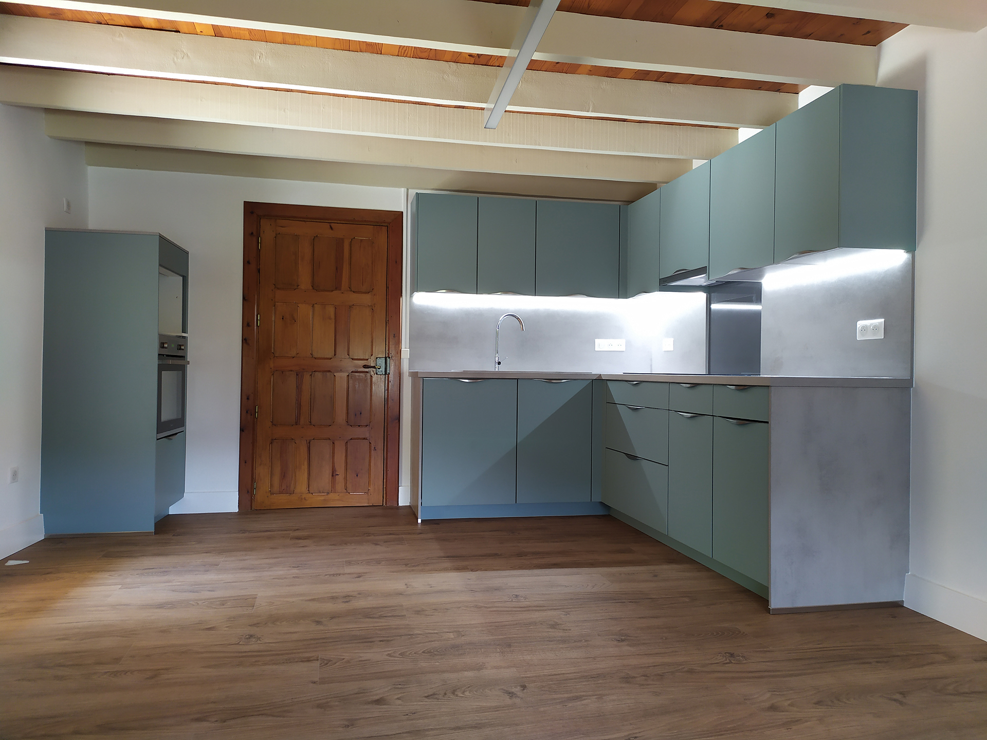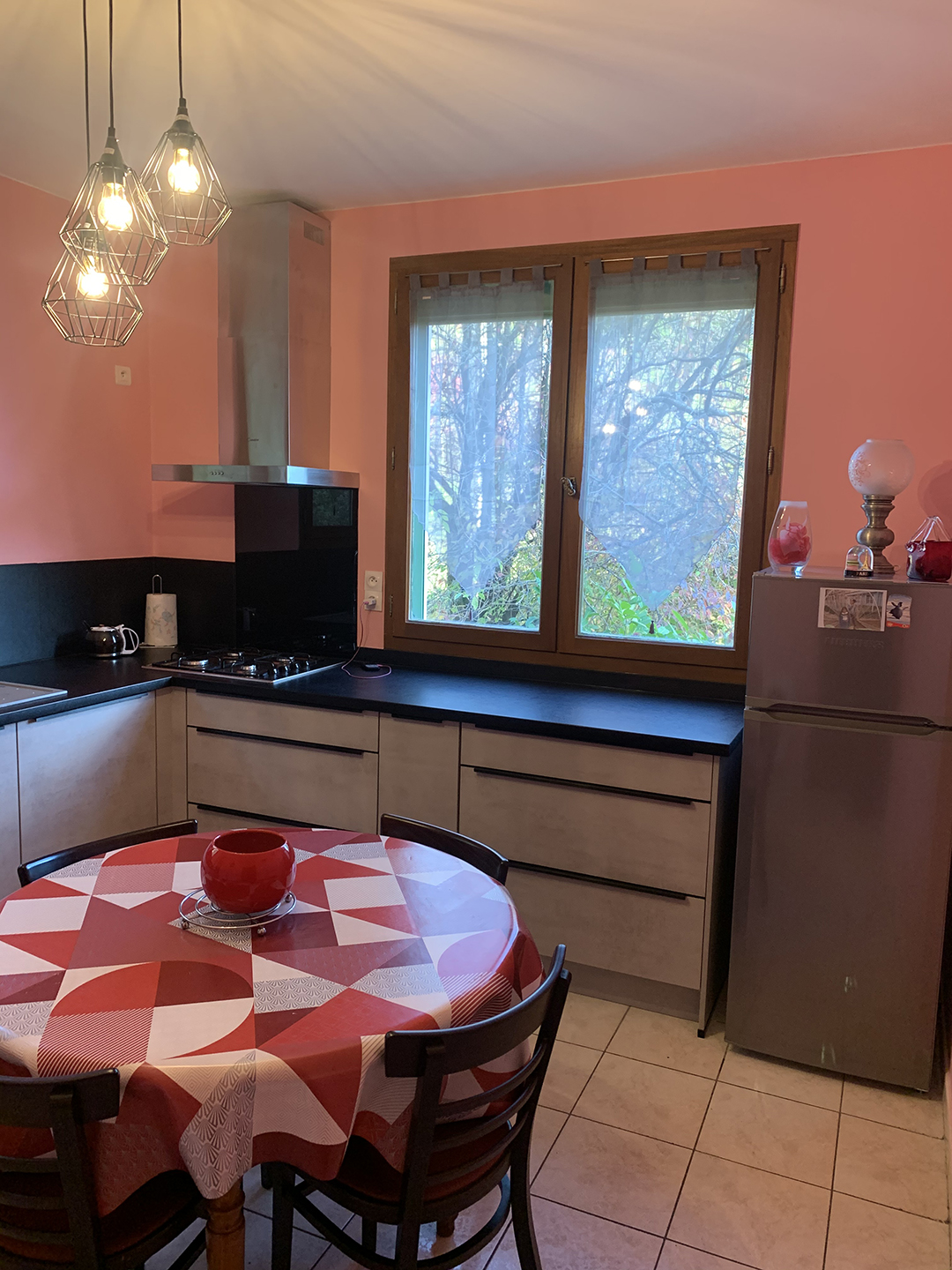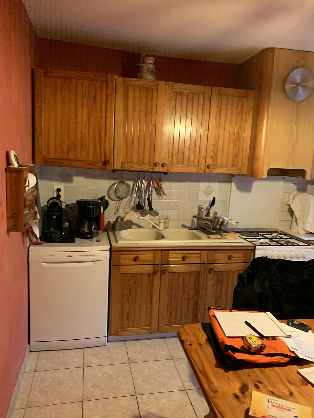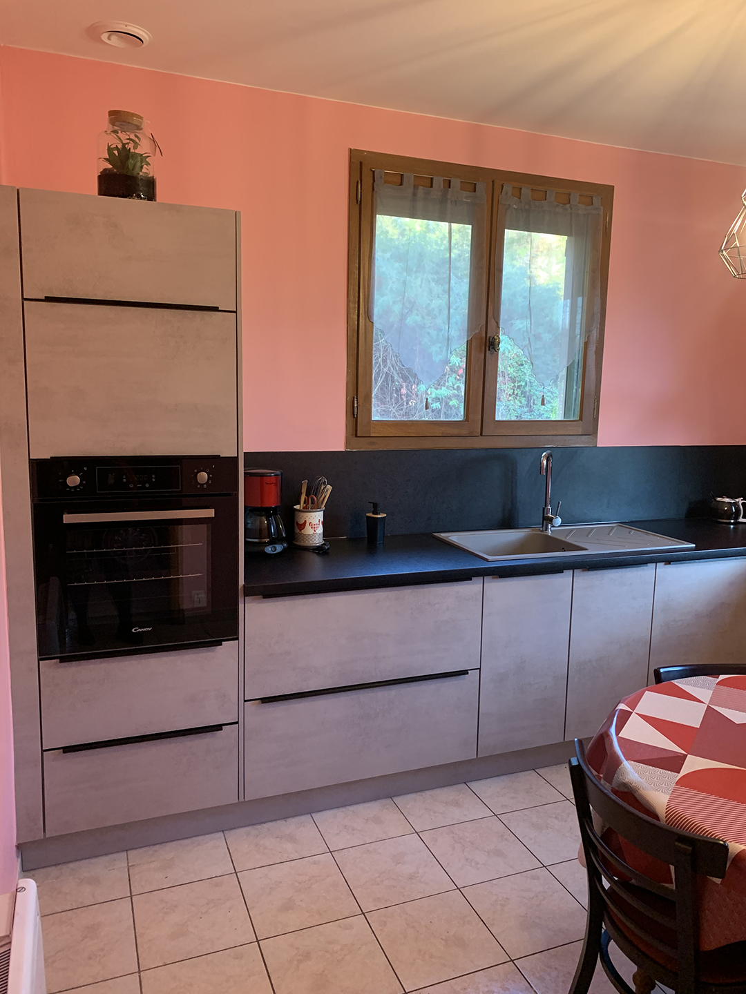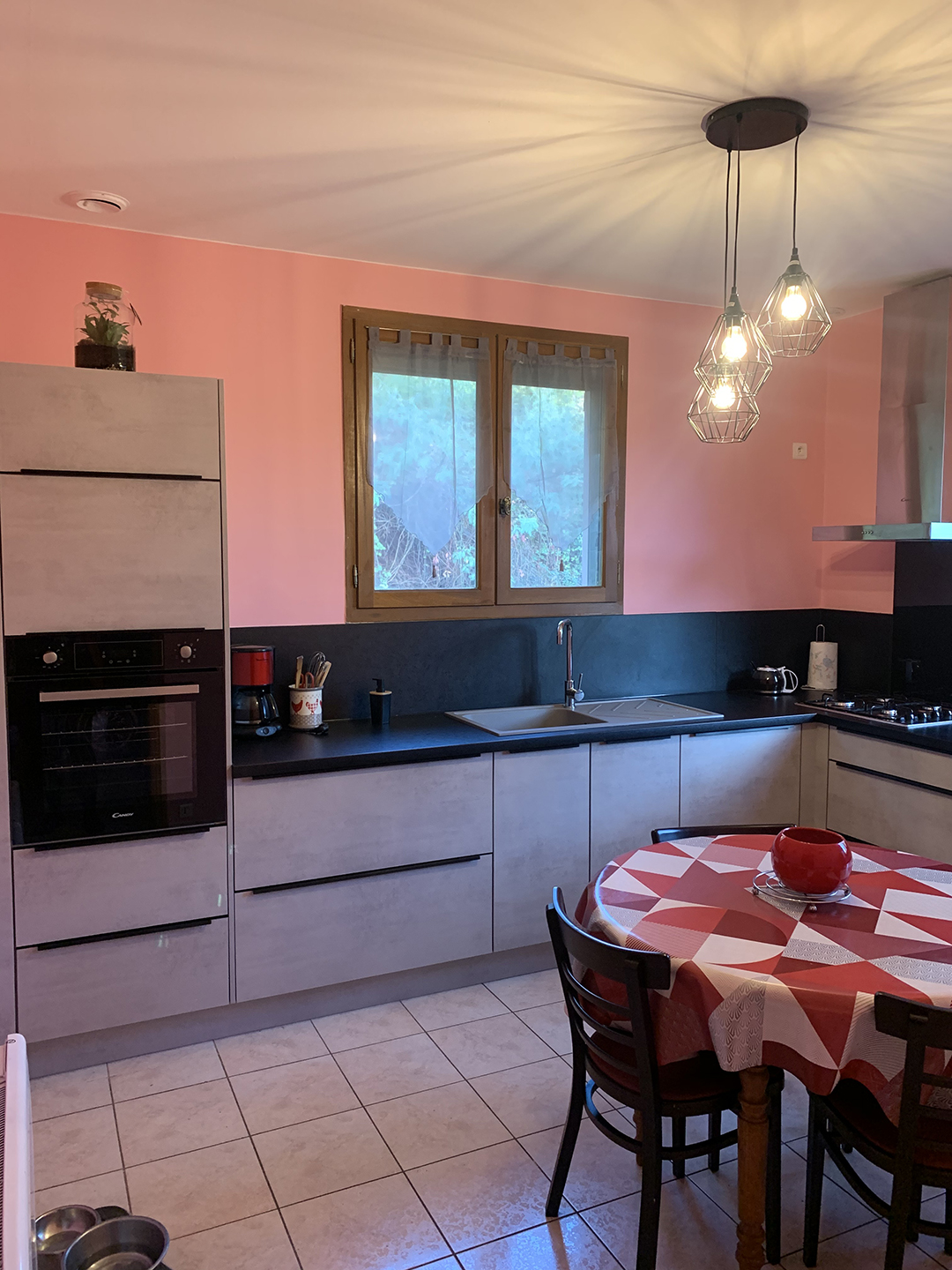 Rénovation d'une cuisine, l'enjeu étant de la rendre plus fonctionnelle avec plus de rangements en conservant un espace repas.