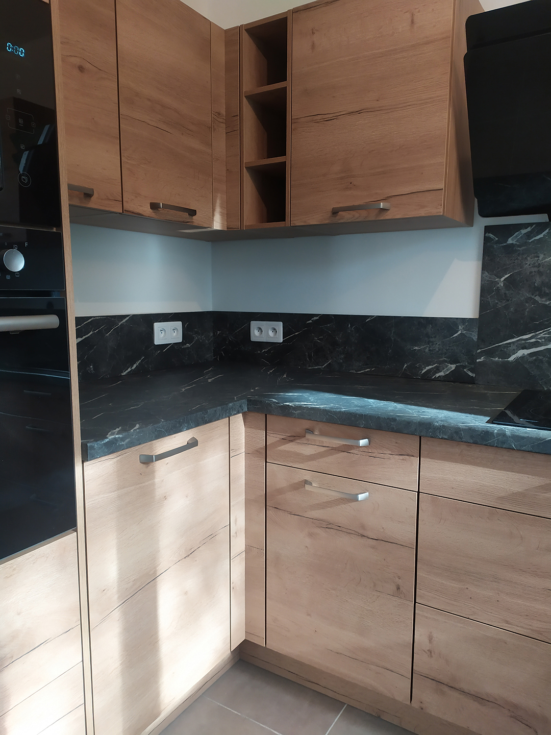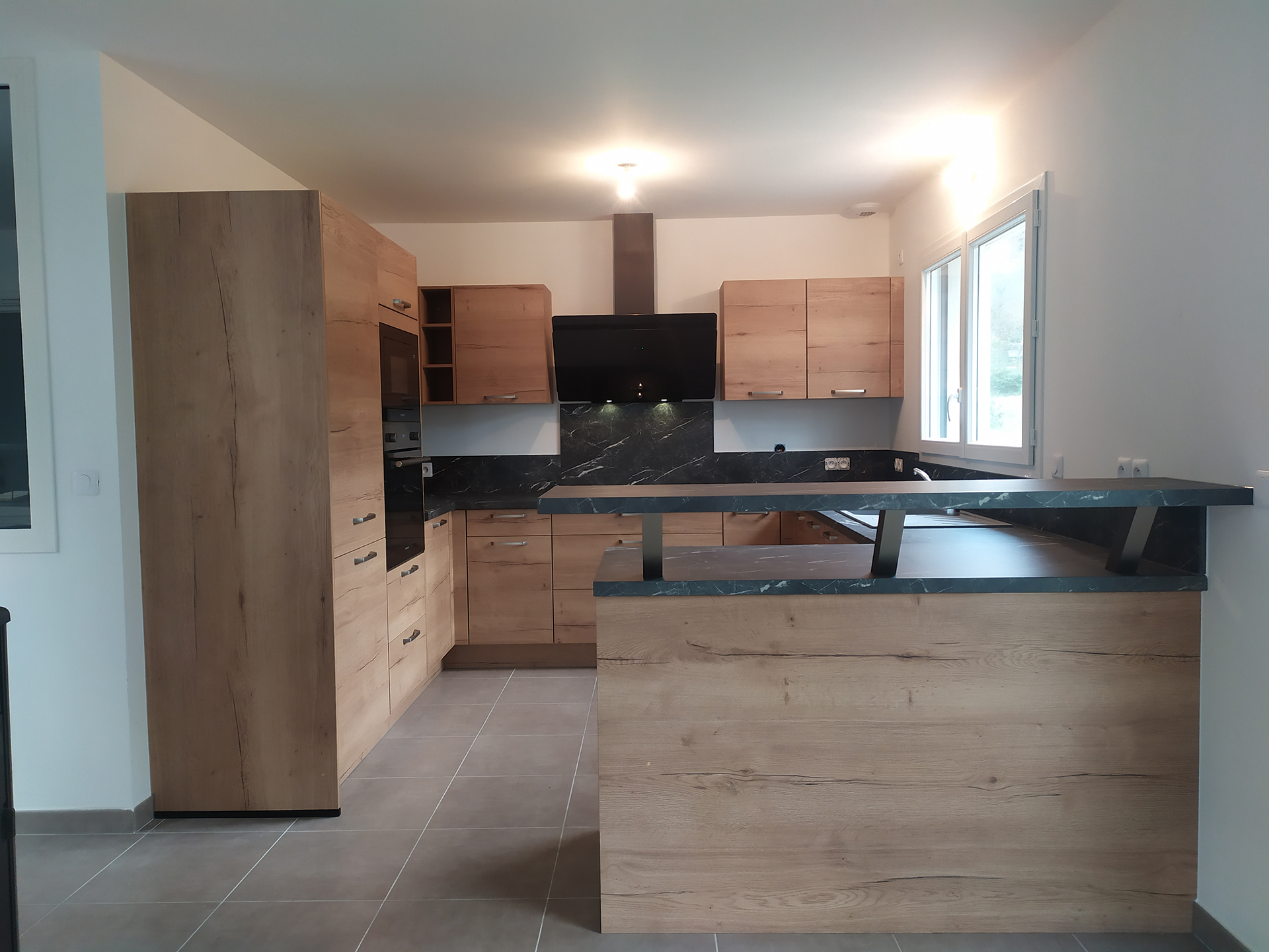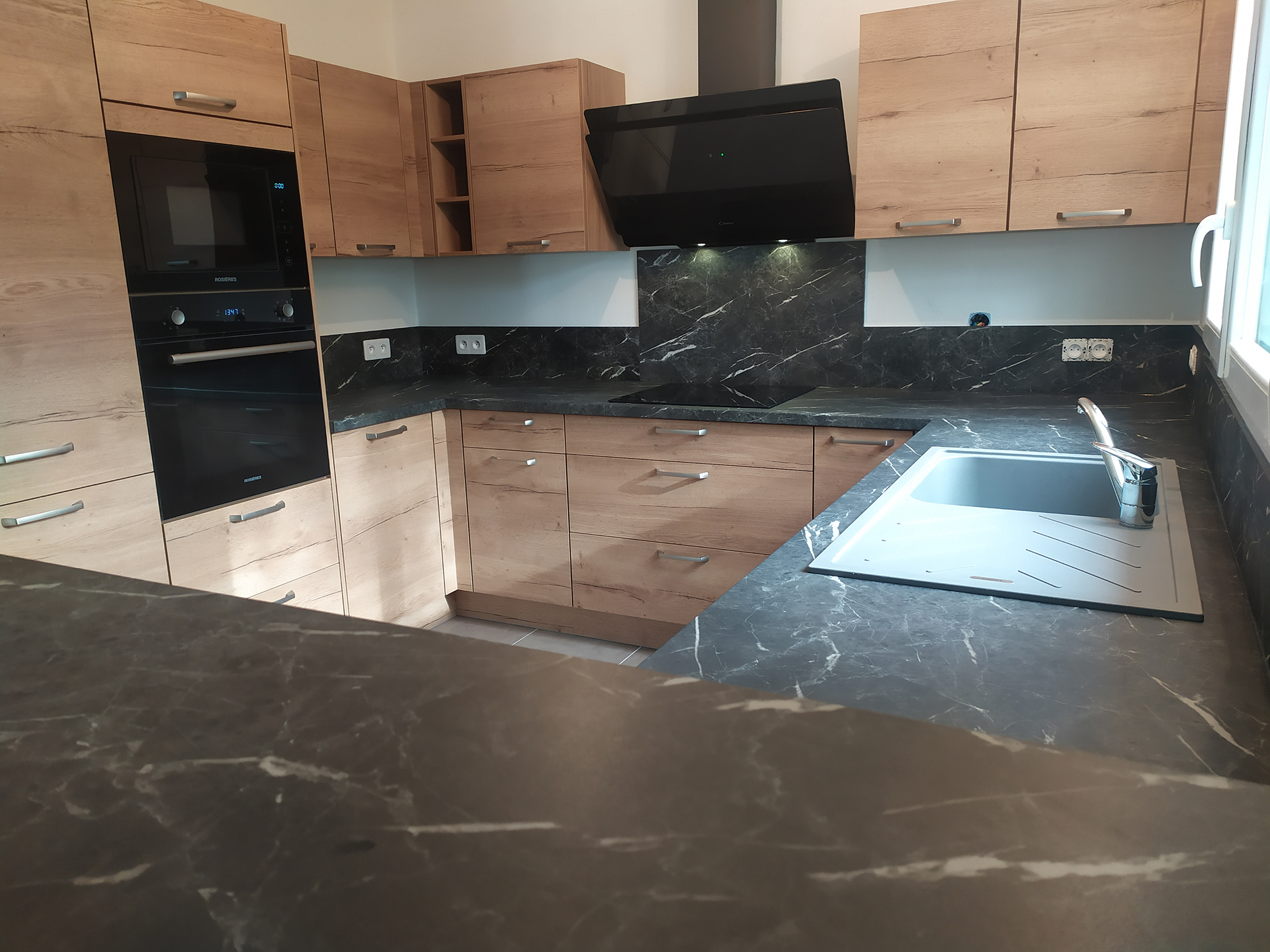 Cette cuisine a été pensée pour gagner en fonctionnalité et en rangement, l’élégance du bois associé à un plan de travail effet marbre donne un côté chaleureux à cette pièce.