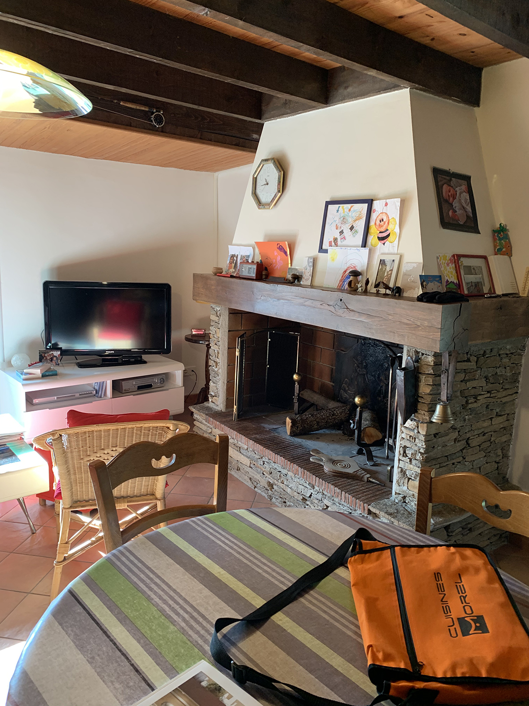La cheminée imposante a laissé place à un meuble télé sur mesure adapté aux besoins de nos clients (coin TV, espace livres, espace multimédia, tiroirs,...) ainsi qu'aux différentes contraintes techniques de la pièce (différence de hauteur de plafond, poutre et climatiseur)